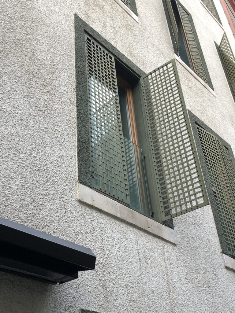 На фисташковые ставни (полагаю металлические?) я заглядывалась ещё с улицы, подумала, что они интересные. Возможно не очень функциональные, но это не мешает им быть интересными. Возможно у них функция защищать не столько от солнца, сколько от глаз соседей в доме напротив, не знаю.