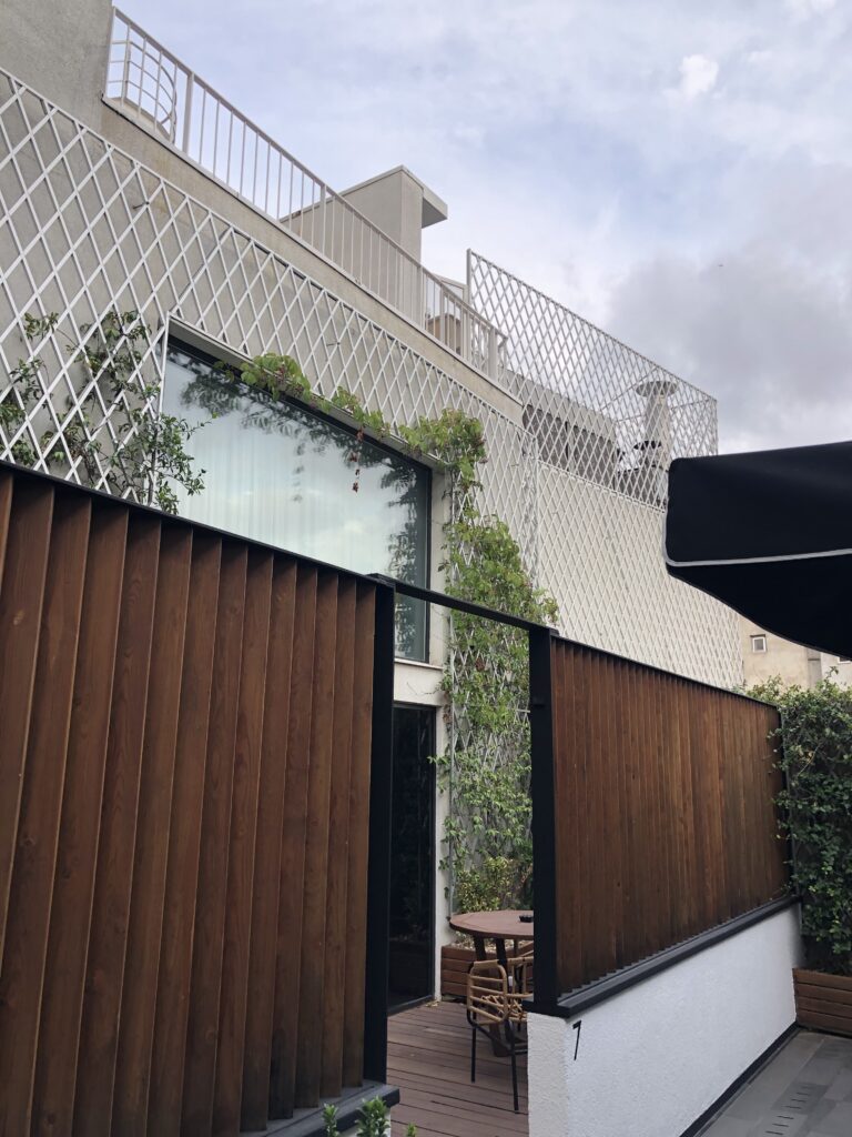 Белые sliding ставни с круглыми отверстиями находятся во внутреннем дворике. Они тоже сделаны из метала, выглядят очень круто, и хотя метал будет хорошо нагреваться на солнце, такую задумку из другого материала реализовать наверно было бы сложно.