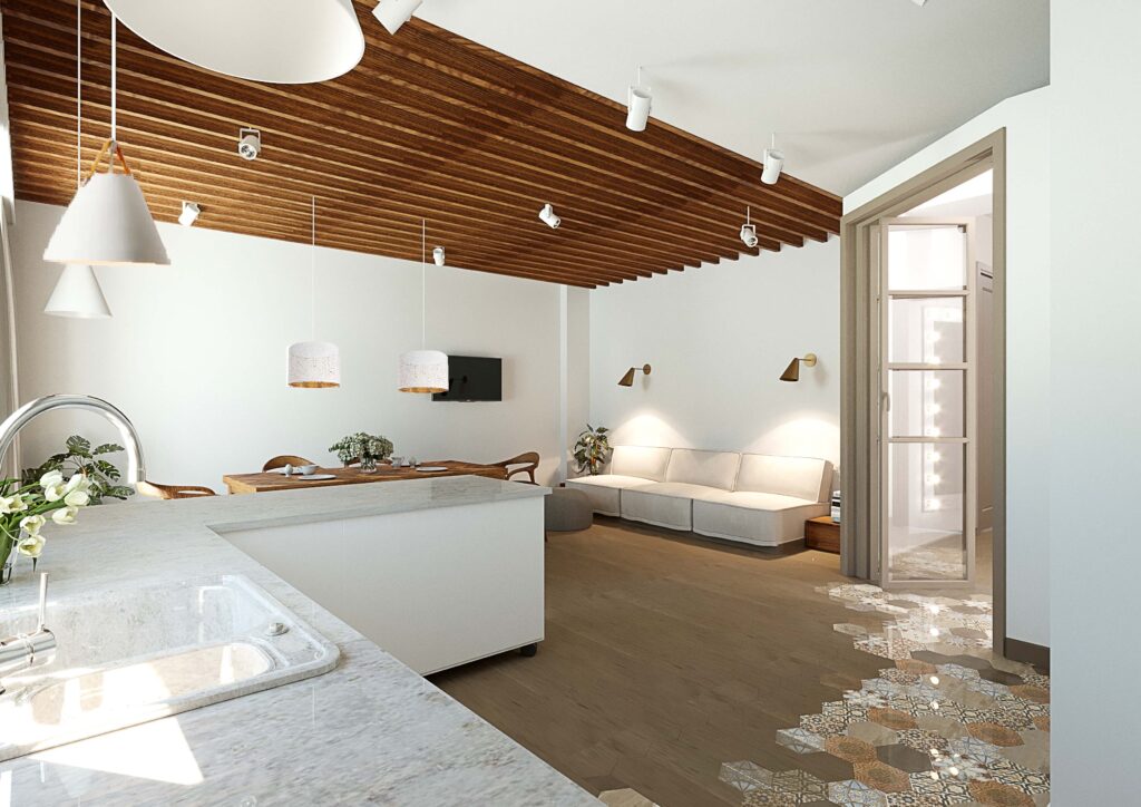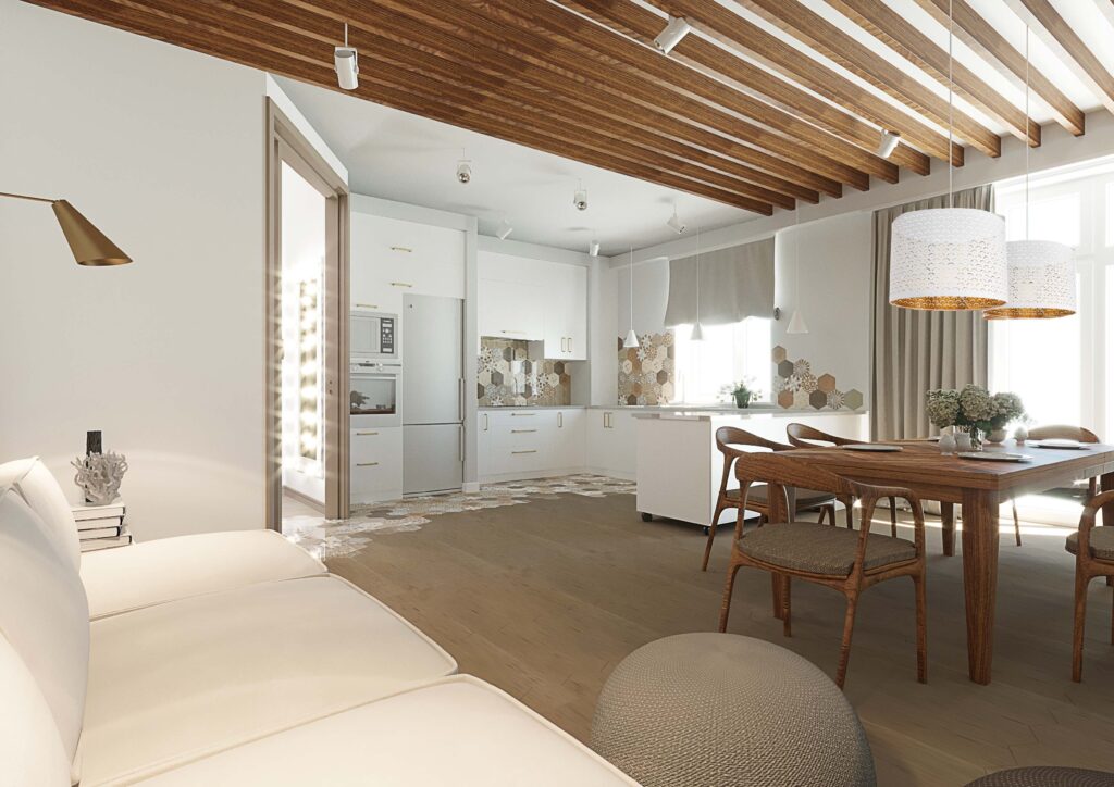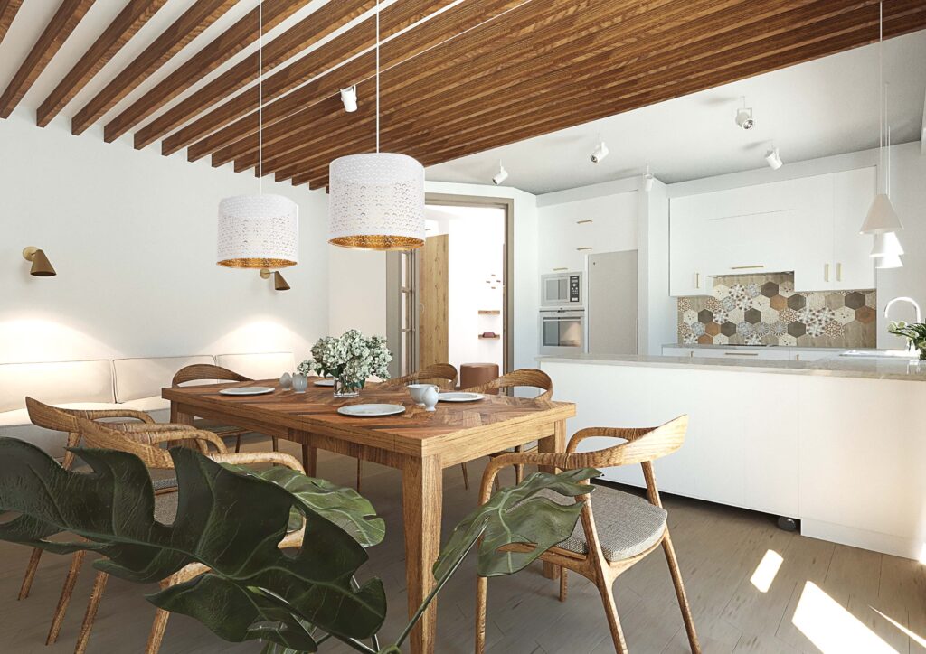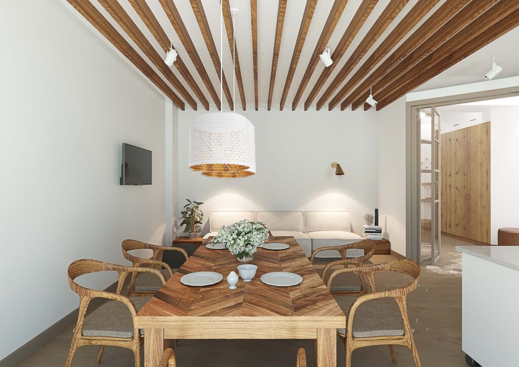 Ключевым материалом проекта стала майолика от узбекского производителя Premium Mosaic. Она использована в отделке столешницы стола, напольного плинтуса и настенного бортика.