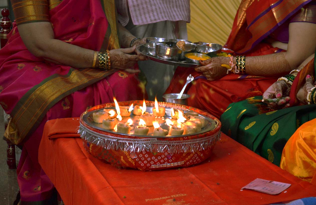 Indian weddings are set on a day considered to be auspicious by a guruji (friendly neighborhood priest) and usually start in the morning around 7:30-8 am. Yes, that early! The weddings end around 2-3pm. Wedding rituals take place on a stage (so everyone can see) and are the longest part of the wedding. There was a part of the ceremony (as I was told a typical Maharashtrian thing) in which every guest had to greet the newlyweds personally. I don’t know how many guests came to the wedding (maybe 300?) but the queue was long. My Indian friends did not feel like queuing and used my foreigner-ignorant-of-local-traditions status to cut in front of others from another end of stage :)))